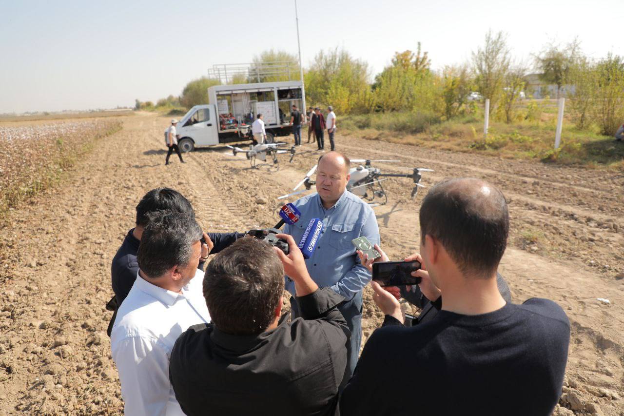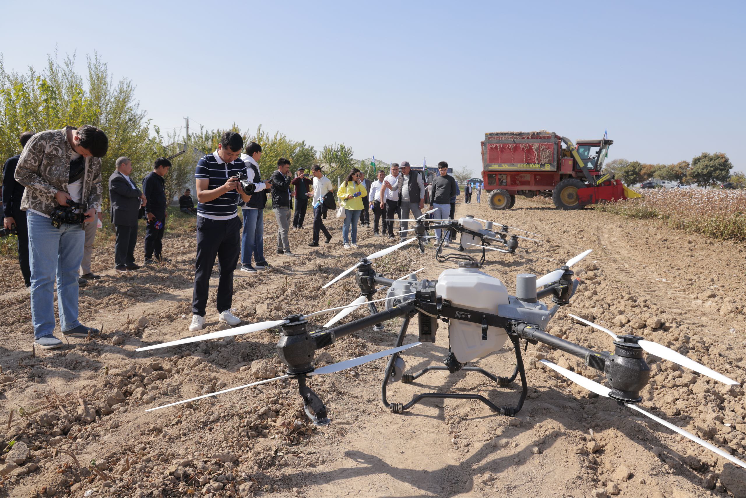 “Paxtachilikda joriy etilgan yangi agrotexnologiyalar samarasi va xorijiy g‘o‘za navlarining hosildorlik ko‘rsatkichlari” mavzusidagi press-tur doirasida Qishloq xo‘jaligi vazirligi tizimidagi “O‘zdavyerloyiha” davlat ilmiy-loyihalash instituti mutaxassislari tomonidan OAV vakillari va soha ekspertlariga uchuvchisiz uchish apparatlari — dronlar yordamida paxta dalalarida agrotexnik tadbirlarni amalga oshirish jarayonlari namoyish etilmoqda. Shu bilan birga, “Bashiran” paxta terish mashinalari yordamida terim ishlari ham tashkil etilib, press-tur ishtirokchilari mexanizatsiyalashgan terim jarayonlarini bevosita kuzatish imkoniga ega bo‘ldilar. Mazkur zamonaviy texnologiyalar dalalarda o‘simliklar holatini tezkor monitoring qilish, suv va o‘g‘itlardan samarali foydalanish, hamda hosildorlikni oshirishga xizmat qiluvchi raqamli yechimlarni joriy etish imkonini bermoqda.
